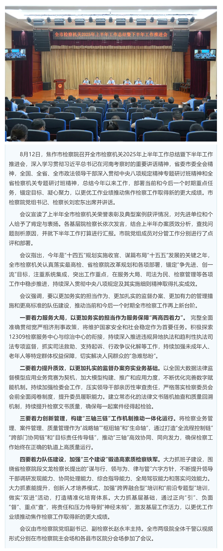 全市检察机关2025年上半年工作总结暨下半年工作推进会强调:坚持“四个着力”,推动焦作检察工作取得新的更大成绩